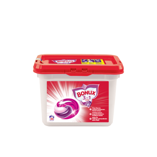Erleben Sie die bequeme Reinigung mit den Bonux 3in1 Caps! Diese praktischen Kapseln vereinen Waschkraft, Fleckenentfernung und Frische in einem einzigen Produkt. Der beruhigende Lavendelduft sorgt für ein frisches und sauberes Gefühl, während die sorgfältig abgestimmte Formel Ihre Wäsche schützt und pflegt.